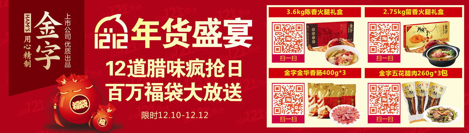 2015呼之欲來,在2014的年末,金字火腿以“12道臘味”致敬你過去1年的辛勞。12月12日,在金字火腿天貓旗艦店,最經典的12款寶貝價格最低2折起,滿318元就送百元福袋(內含2包45g肉棗、2包40g火腿片、1張肉票、1份利是封),還可參加抽大獎活動,屆時將會抽取2名價值不菲的巴瑪火腿大獎和24名價值500元的12道臘味大獎。