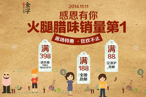 入了12月的江南,空氣中總會飄散著一股似近似遠的肉香味,勾人魂魄到直咽口水。窗檐下懸掛的香腸臘肉有一種“年之將近”的即視感,因為那就是刻到骨子里的年味啊。就算時代再變化,“小雪腌菜,大雪腌肉”的習慣依然被懂得生活的人代代傳承著。2014年的金字天貓旗艦店雙12來了,為您準備的好臘味上新,十二道臘味年前抄底價。春運車票已經可以買了,臘味也同樣:回家過春節,你準備好了沒有?